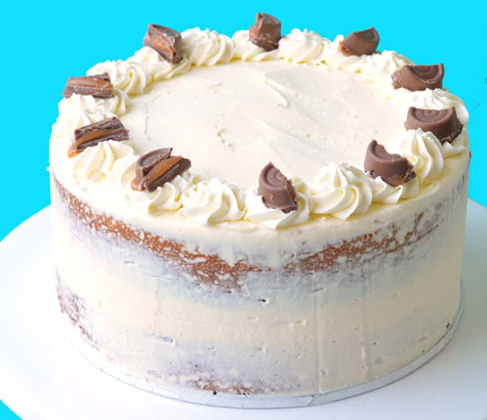 A rich, two layer Caramel Mud Cake with a delicate piece and a velvety, luxurious, white chocolate icing. Twirls of whipped cream and gooey caramel Rolos take this cake to the following dimension.